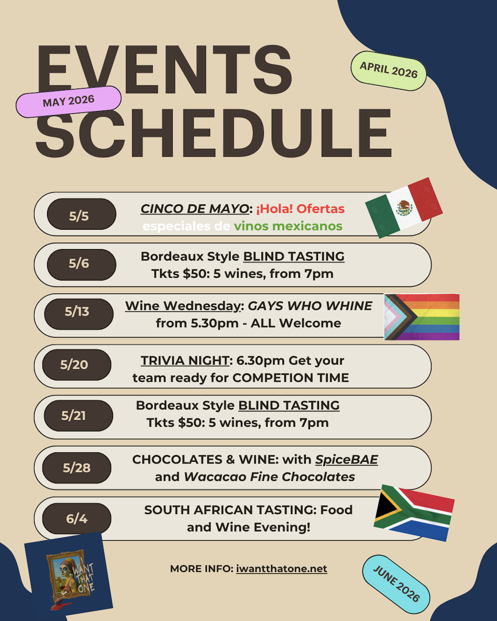 Rooted in a love of international wine regions and creative communities, I Want That One regularly hosts wine tastings, artist showcases, and special events featuring visiting winemakers and creatives from around the world. Our offerings rotate often, our pours are intentional, and our shelves are always evolving.